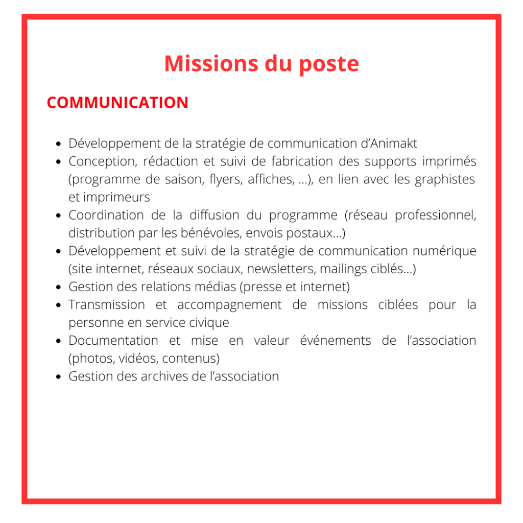 Animakt recrute CHARGÉ.E DE COMMUNICATION & COORDINATION DES RÉSIDENCES Par l'équipe d'Animakt Publié Le mercredi 11 mars 2026 Annonce В Télécharger l'offre d'emploi Е Postuler